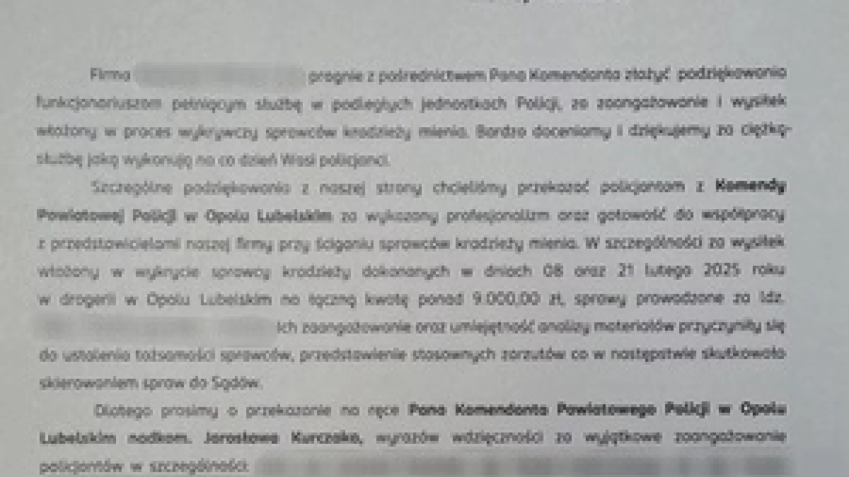 Podziękowania trafiły do komendanta wojewódzkiego Policji w Lublinie, który przekazał je komendantowi powiatowemu Policji w Opolu Lubelskim.