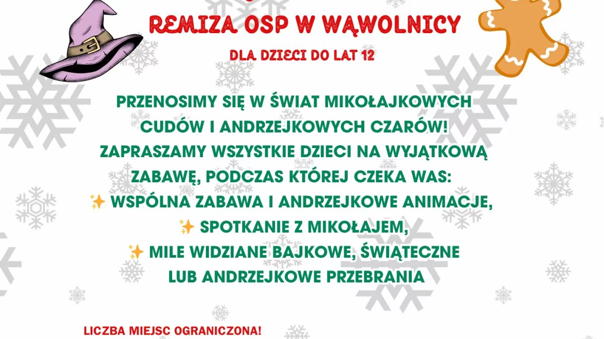 Gminny Dom Kultury w Wąwolnicy wspólnie z Kołem Gospodyń Wiejskich Babki z Pomysłem przygotowują dla najmłodszych niezapomniany wieczór pełen czarów, radości i świątecznego nastroju. Już 5 grudnia o godz. 17:00 w Remizie OSP w Wąwolnicy odbędzie się zabawa andrzejkowo‑mikołajkowa dla dzieci do 12. roku życia.