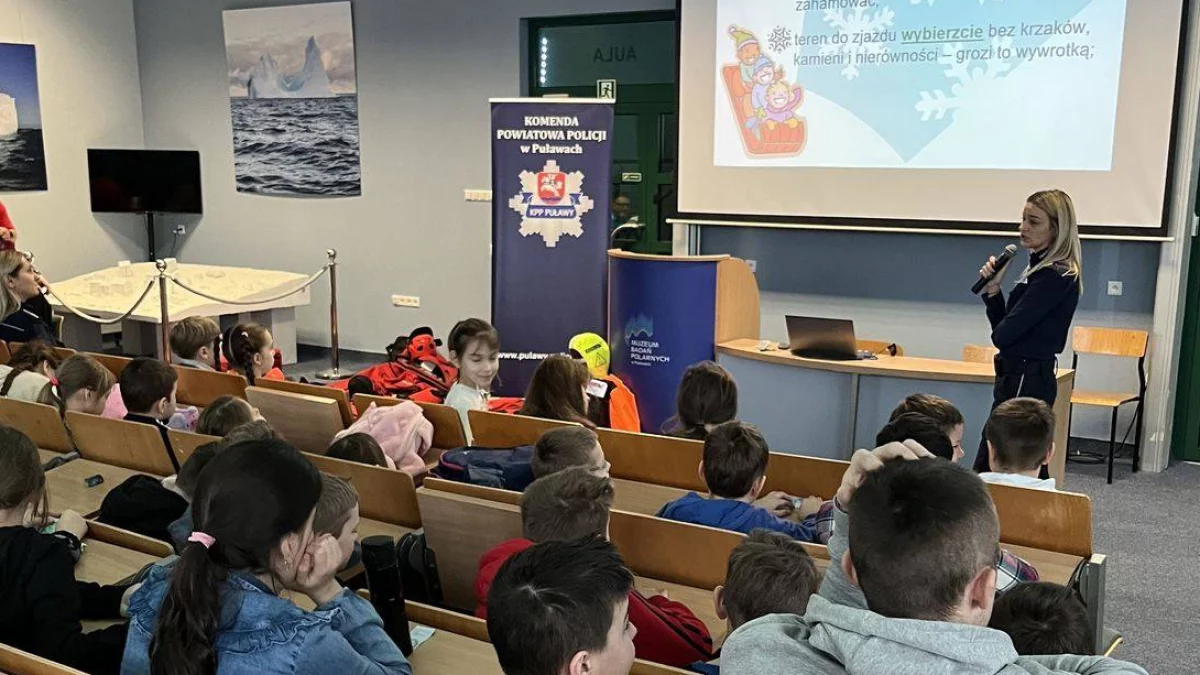 Walentynkowe spotkanie zgromadziło pracowników muzeum, policjantów, strażaków oraz ratowników wodnych, którzy wspólnie przekazali dzieciom kluczowe informacje dotyczące zasad bezpiecznego spędzania ferii zimowych.