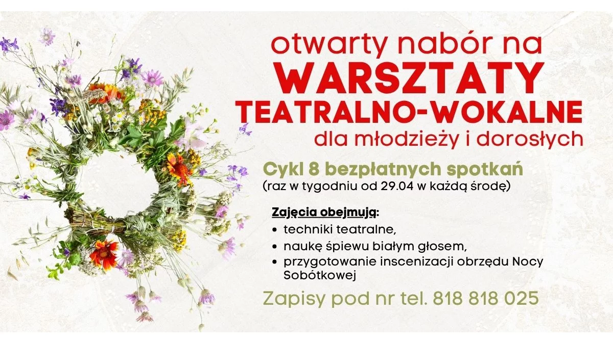 Uczestnicy będą pracować nad przygotowaniem inscenizacji obrzędu Nocy Sobótkowej – jednego z najbardziej znanych i symbolicznych zwyczajów słowiańskich, związanego z przesileniem letnim. Zajęcia obejmują szeroki zakres działań artystycznych: techniki teatralne, naukę śpiewu białym głosem – charakterystycznej formy śpiewu ludowego oraz przygotowanie widowiska obrzędowego. Poprowadzi je Marta Sterlus – pedagog i pasjonatka kultury tradycyjnej, specjalizująca się w muzyce ludowej i teatrze obrzędowym. Jest ona laureatką I nagrody w kategorii Soliści Śpiewacy podczas Ogólnopolski Festiwal Kapel i Śpiewaków Ludowych.
