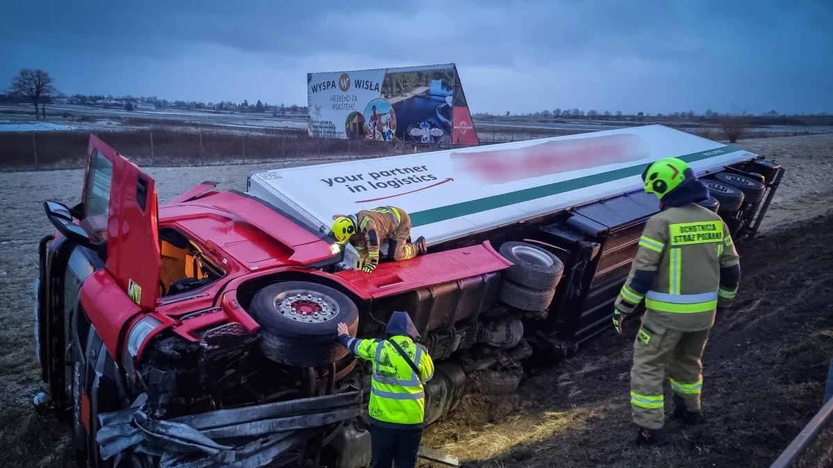 Zima nie odpuszcza, o czym dzisiejszego poranka mogli się przekonać kierowcy. Warunki na drogach nie były najlepsze - jezdnia była śliska, padał deszcz ze śniegiem - czego doświadczył kierowca dostawczej Scani. Tuż po godz. 5:00 na drodze ekspresowej S12 na jezdni w kierunku Lublina między węzłem Kurów Wschód a węzłem Nałęczów samochód wypadł z drogi i przewrócił się na bok, uszkadzając po drodze bariery energochłonne. Na pomoc kierowcy, 55-letniemu obywatelowi Ukrainy, ruszyli strażacy z Puław i druhowie z Ochotniczej Straży Pożarnej w Markuszowie oraz załoga pogotowia. Na miejscu interweniowali również policjanci z Komisariatu Policji w Kurowie.
