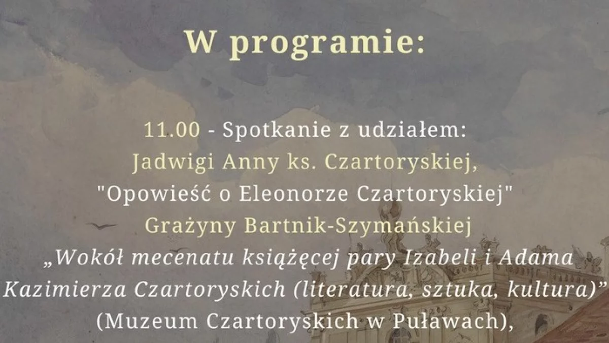 W programie wydarzenia znajdzie się m.in. wystąpienie Jadwigi Anny księżnej Czartoryskiej, opowieść Grażyny Bartnik-Szymańskiej o Eleonorze Czartoryskiej, a także referaty prof. Michała Mencfela poświęcone mecenatowi kulturalnemu Izabeli i Adama Kazimierza oraz sentymentalnemu kolekcjonerstwu Izabeli Czartoryskiej. Dyskusję poprowadzi dr Amelia Korzeniewska.