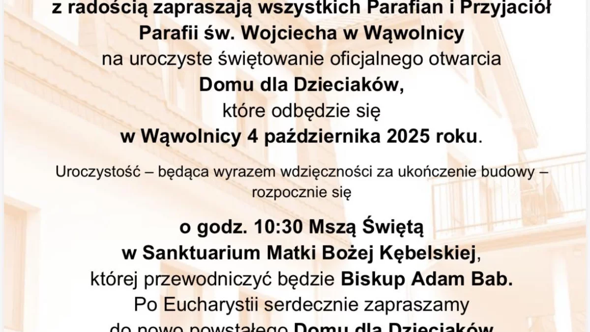 Bezpośrednio po Eucharystii, siostry zapraszają wszystkich parafian, przyjaciół i dobroczyńców do nowo wybudowanego Domu dla Dzieciaków – miejsca, które powstało z miłości i troski o najmłodszych. Na gości będzie czekał poczęstunek, a także możliwość zwiedzania budynku, którego powstanie było możliwe dzięki wieloletniemu wsparciu duchowemu, finansowemu i rzeczowemu wielu osób i instytucji.