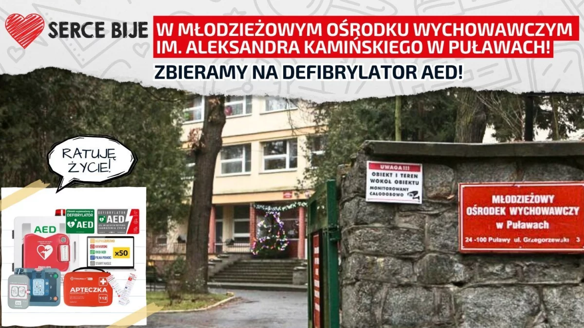 Podopieczni Młodzieżowego Ośrodka Wychowawczego w Puławach podejmują wiele inicjatyw. Angażują się w sprzątanie okolicy, czy pomoc w wyprowadzaniu psów mieszkających w puławskim schronisku dla bezdomnych zwierząt. Teraz wpadli na pomysł zakupu przenośnego defibrylatora. Podobne urządzenia dla ratowania życia znajdują się już w naszym mieście, tak więc ten w MOW nie byłoby pierwszym. Oprócz defibrylatora placówka chciałaby kupić także klucz pediatryczny Philips FRx – dla bezpiecznego użycia AED u dzieci, apteczkę pierwszej pomocy, szafkę z alarmem na defibrylator, szkolenie on-line z pierwszej pomocy, film instruktażowy „Jak użyć AED”, z którym zapozna się cała społeczność MOW oraz materiały edukacyjne w postaci zakładek z instrukcją pierwszej pomocy.