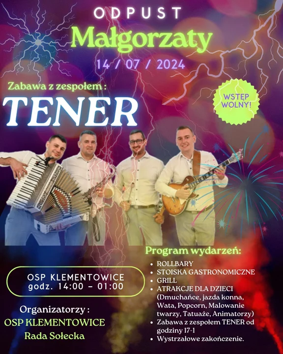 A okazją do wspólnej zabawy będzie odpust w miejscowej parafii pw. Św. Klemensa i Św. Małgorzaty. Wydarzenie rozpocznie się wczesnym popołudniem w niedzielę 14 lipca. Już od godz. 14.00 na terenach przyległych do remizy OSP na mieszkańców i gości będą czekały atrakcje - rollbary, stoiska gastronomiczne, na których można będzie zakupić coś na ząb, czy grill. Organizatorzy nie zapomnieli również o najmłodszych. Dzieci będą mogły poszaleć na dmuchanych zjeżdżalniach, albo skorzystać z przejażdżki konnej. O to, by maluchy się nie nudziły zadbają animatorzy, a w przerwach od zabawy będzie można zjeść popcorn, albo zrobić sobie tatuaż (oczywiście zmywalny). Uczestnikom rodzinnego pikniku od godz. 17.00 aż do późnych godzin nocnych czas będzie umilał zespół muzyczny.