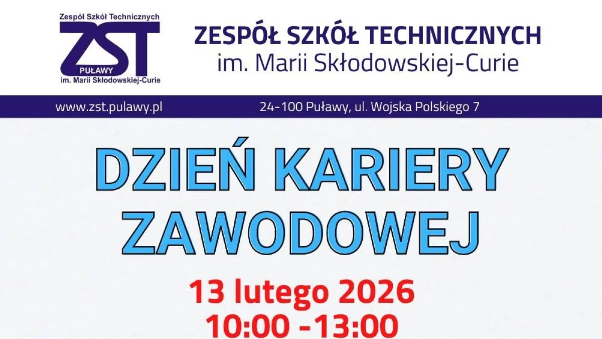 W piątek 13 lutego, w godz. 10:00 - 13:00 w Zespole Szkół Technicznych im. Marii Skłodowskiej-Curie w Puławach przy ul. Wojska Polskiego odbędzie się Dzień Kariery Zawodowej. Swoją ofertę przedstawią szkoły ponadpodstawowe i policealne z Puław i powiatu puławskiego, uczelnie wyższe, pracodawcy, banki i instytucje finansowe. Młodzież i osoby odwiedzające ZST będą miały okazję poznać rynek pracy, zasady zakładania i prowadzenia działalności gospodarczej, a także uzyskają informacje, jak pozyskiwać środki finansowe i kredyty studenckie.