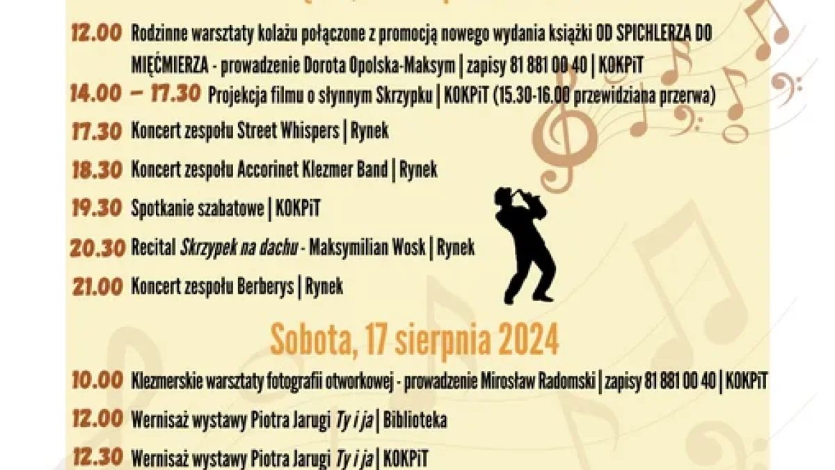W piątek oraz sobotę będzie można zaznajomić się z tą kulturą. Festiwal Klezmerski rozpocznie się 16 sierpnia o godz. 12. Na samo otwarcie zaplanowano rodzinne warsztaty kolażu "Muzyczny Kazimierz", które zostanie poprowadzone przez Dorotę Opolską-Maksym. W programie przewidziano również projekcję filmu o słynnym skrzypku, koncerty czy spotkanie szabatowe.