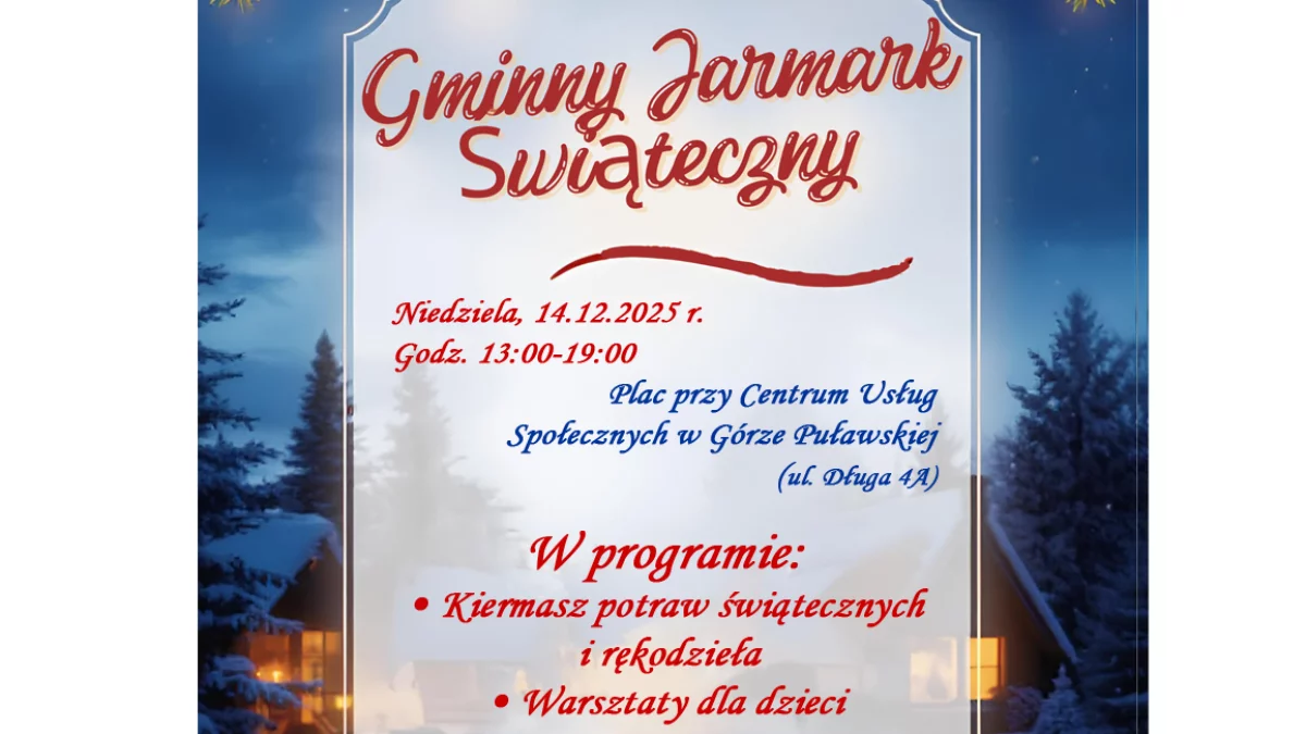 Wydarzenie będzie trwać od 13:00 do 19:00. Na odwiedzających czeka świąteczny kiermasz pełen tradycyjnych potraw, lokalnych specjałów oraz unikatowego rękodzieła przygotowanego przez koła gospodyń wiejskich z terenu gminy. Program artystyczny uświetnią kolędy i prezentacje przygotowane przez Gminny Ośrodek Kultury w Gołębiu oraz uczniów szkół podstawowych z Góry Puławskiej i Leokadiowa. Dla najmłodszych zaplanowano ubieranie choinki, warsztaty ozdób świątecznych oraz spotkanie w zagrodzie kóz rasy kazimierskiej. Lokalni strażacy rozpalą ognisko dla mieszkańców. Wydarzenie współorganizują lokalne koła gospodyń wiejskich oraz Gmina Puławy.