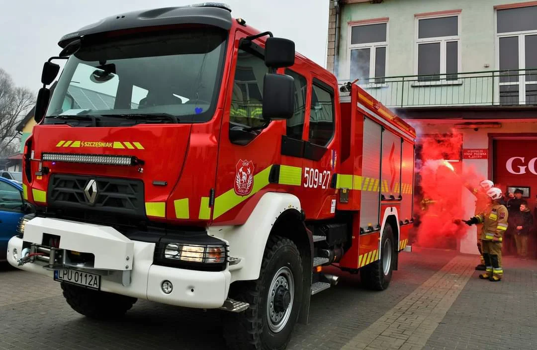 Autor: Danuta Smaga - Starosta Puławski/Facebook | Opis: Na akcje strażackie druhowie z Gołębia będą jeździć wozem bojowym marki Renault, który kosztował 1,12 mln zł