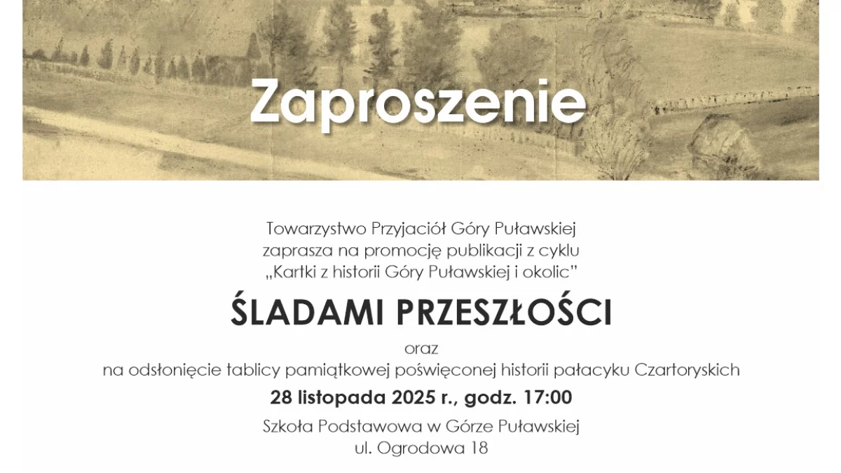 Wydarzenie będzie okazją do promocji publikacji z cyklu "Kartki z historii Góry Puławskiej i okolic". Goście wezmą udział w odsłonięciu tablicy pamiątkowej poświęconej historii pałacyku Czartoryskich, jednego z najcenniejszych obiektów dawnej Góry Puławskiej. Miejscem spotkania będzie Szkoła Podstawowa im. Żołnierzy 2 Dywizji Piechoty 1 Armii Wojska Polskiego. Zapraszamy wszystkich mieszkańców.