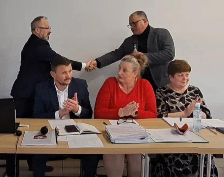 Autor: Screen z sesji/Facebook | Opis: Andrzej Bujek głosami radnych po raz kolejny otrzymał wotum zaufania oraz absolutorium z wykonania budżetu gminy za 2023 r. Gratulacje złożył m.in. wiceprzewodniczący Rady Gminy Żyrzyn Sebastian Walaszek