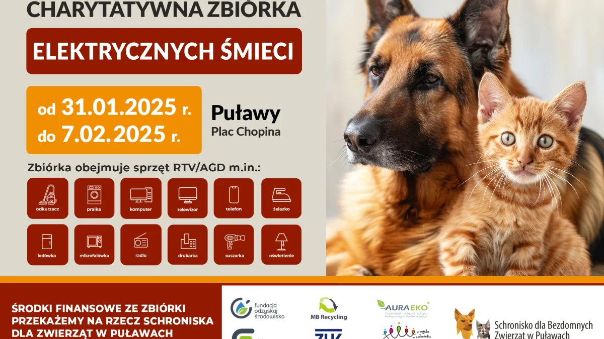 Akcję organizują wspólnie Fundacja Odzyskaj Środowisko, MB Recycling oraz Urząd Miasta w Puław. Inicjatywę, z której dochód będzie w całości przekazany dla schroniska, może wesprzeć każdy, wystarczy między 31 stycznia a 7 lutego przynieść zużyty sprzęt elektryczny lub elektronicznych do kontenera ustawionego na Placu Chopina w centrum miasta. Mieszkańcy będą mieli okazję pozbyć się zalegających w piwnicach czy garażach elektrośmieci, zarówno mniejszych, jak i większych sprzętów, t.j. pralki czy lodówki.