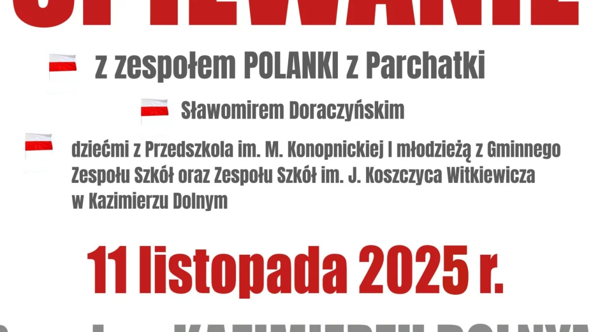 Wydarzenie organizowane z okazji Narodowego Święta Niepodległości będzie pełne muzyki, wspólnego śpiewania i radosnego świętowania. Na scenie wystąpi zespół POLANKI z Parchatki oraz Sławomir Doraczyński, a także dzieci z Przedszkola im. Marii Konopnickiej i młodzież z Gminnego Zespołu Szkół oraz Zespołu Szkół im. Jana Koszczyca Witkiewicza w Kazimierzu Dolnym.