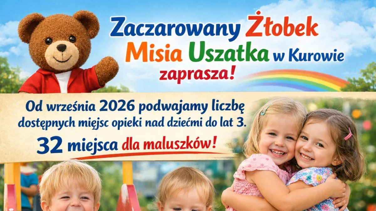 Do tej pory żłobek oferował 16 miejsc dla dzieci dla dzieci do 3. roku życia. Ale od września placówka będzie mogła zapewnić opiekę aż 32 milusińskim. Mieszkańcy gminy zainteresowani ofertą żłobka muszą działać już teraz. Właśnie trwają zapisy na nowy rok szkolny. Rekrutacja trwa do wtorku 21 kwietnia. Zainteresowani mogą bezpośrednio ze żłobka lub ze strony internetowej Urzędu Miejskiego w Kurowie pobrać niezbędne druki, wydrukować, wypełnić i złożyć z sekretariatu placówki. W dokumentach należy wskazać m.in. w jakich godzinach dziecko będzie przebywać w placówce (minimalny czas pobytu to 5 godzin) oraz z jakich posiłków będzie korzystać. Zaczarowany Żłobek Misia Uszatka pracuje codziennie od poniedziałku do piątku (oprócz dni ustawowo wolnych) od godz. 6:30 do 16:00.