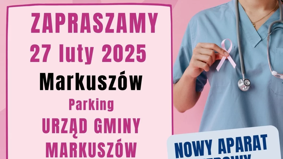 Szansę na wykonanie całkowicie darmowej mammografii niebawem będą miały mieszkanki Markuszowa i okolic. W czwartek 27 lutego przy markuszowskim urzędzie gminy (ul. Marka Sobieskiego 1) zaparkuje mammobus. Badanie jest przeznaczone dla kobiet między 45. a 74. rokiem życia. Aby skorzystać z bezpłatnej diagnostyki piersi należy wcześniej zapisać się dzwoniąc pod numer 723 351 003. Pod tym numerem dowiemy się również wszystkich szczegółów.