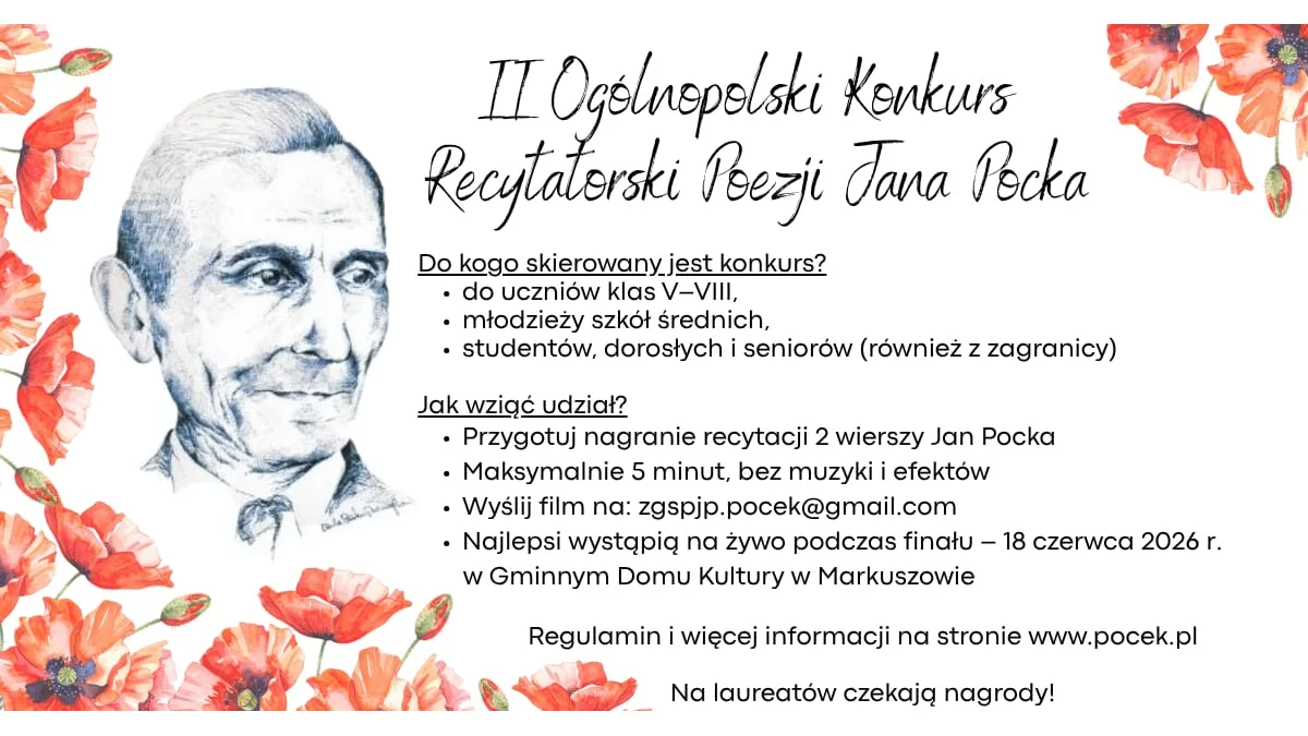Organizatorami konkursu jest Stowarzyszenie Pamięci Jana Pocka w Kaleniu, Gminny Dom Kultury w Markuszowie oraz miejscowa szkoła podstawowa. Zmagania będą składały się z dwóch etapów. Każdy z uczestników ma za zadanie przygotować recytację dwóch wybranych wierszy poety, a nagranie swojego wykonania przesłać na adres: email zgspjp.pocek@gmail.com lub na adres korespondencyjny Stowarzyszenie Pamięci Jana Pocka, Zarząd Główny, Kaleń 3, 24-173 Markuszów (lub dostarczyć osobiście) wraz z załącznikami tj. Kartą Uczestnika, zgodą na przetwarzanie danych osobowych i wykorzystanie wizerunku do 30 kwietnia. Wszystkie wymagane załączniki można pobrać ze strony internetowej www.pocek.pl. Tam również znajduje się pełny regulamin konkursu. Co ważne, nagranie recytacji nie może być dłuższe, niż 5 minut. Następnie jury zapona się ze zgłoszeniami i do 20 maja wskaże uczestników, którzy zakwalifikowali się do drugiego etapu. Ten będzie miał miejsce 18 czerwca w Gminnym Domu Kultury w Markuszowie.