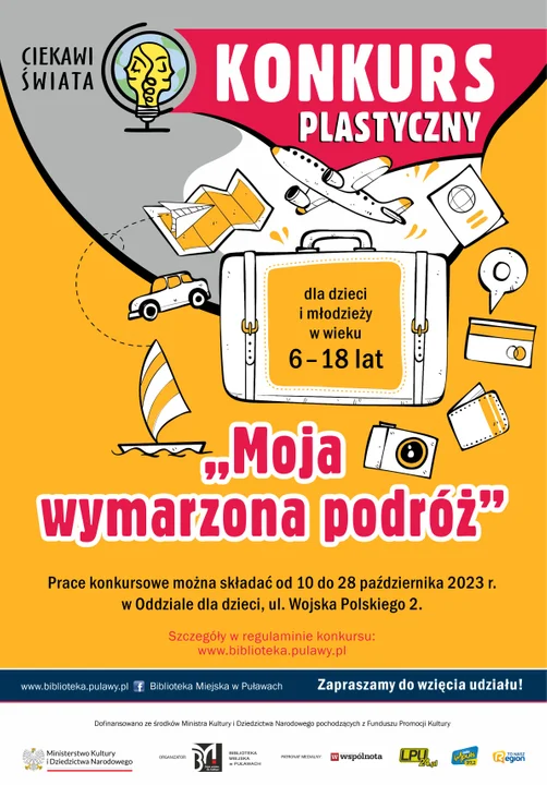 Konkurs plastyczny „Moja wymarzona podróż” jest realizowany w ramach projektu „Ciekawi świata” dofinansowanego ze środków Ministra Kultury i Dziedzictwa Narodowego pochodzących z Funduszu Promocji Kultury.