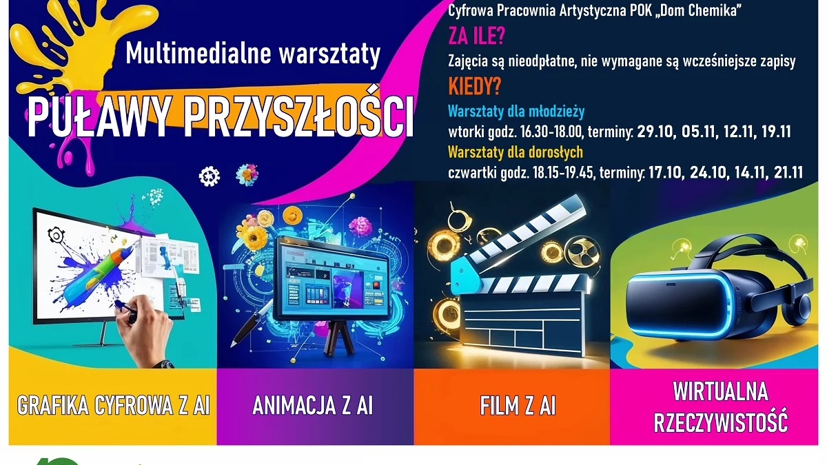 ,,Multimedialne warsztaty Puławy przyszłości" to propozycja dla młodzieży i dorosłych, aby doświadczyć tworzenia w nowoczesny, innowacyjny sposób. Wprowadzające w tematykę zajęcia grupowe będą prowadzone w 4 obszarach: grafika, animacja, film i wirtualna rzeczywistość. Następnie będzie możliwość indywidualnego tworzenia i uczestniczenia w konsultacjach ze specjalistami w dziedzinie nowoczesnych technologii. Projekt podsumuje interaktywna wystawa, która przedstawi efekty działań uczestników.