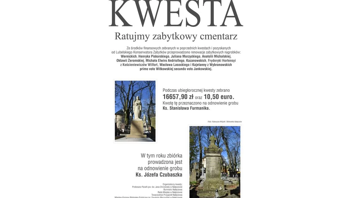 - To nie tylko zbiórka na odnowienie pięknych pomników, ale także hołd dla przeszłych pokoleń i sposób na utrwalenie historii tego niezwykłego miejsca - zapewniają organizatorzy kwesty. - Dzięki dotychczasowym zbiórkom udało się przywrócić blask wielu nagrobkom, takim jak groby Henryka Piskorskiego, Juliana Morzyckiego, Michała Elwira Andriollego i innych zasłużonych dla historii Nałęczowa. W ubiegłym roku zebrano 16,657,90 zł oraz 10,50 euro, które przeznaczono na renowację grobu ks. Stanisława Furmanika. Tegoroczna kwesta będzie wspierać odnowienie grobu ks. Józefa Czubaszka - dodają.