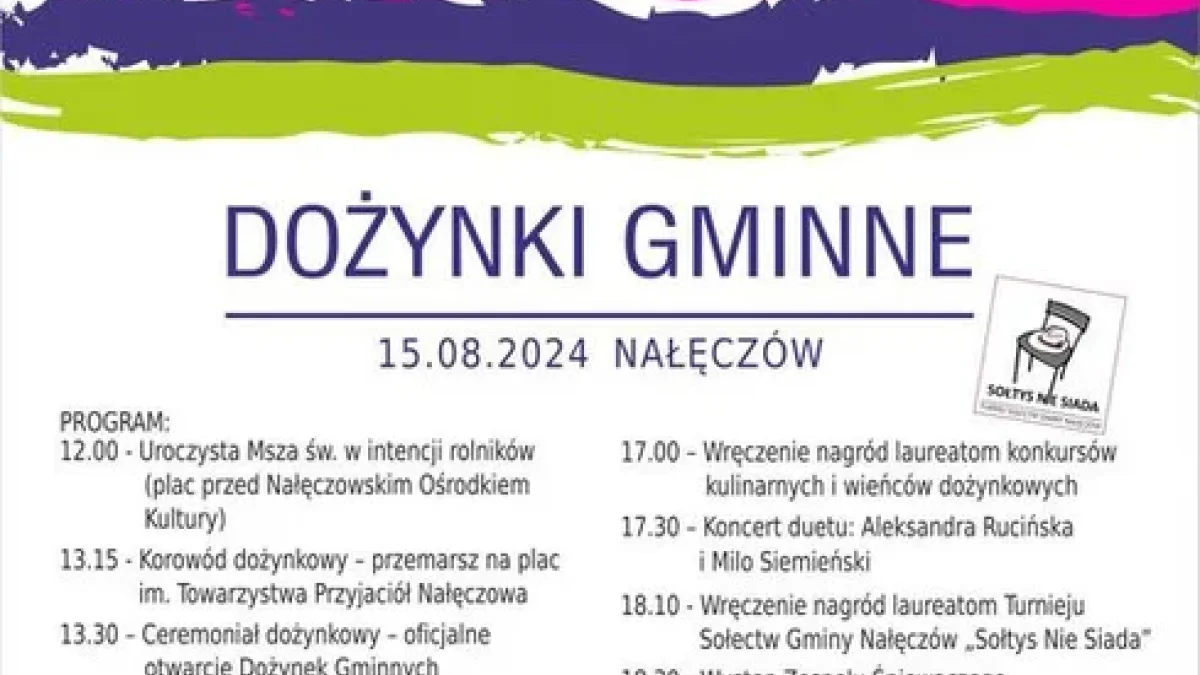 - Dożynki to jeden z piękniejszych i ważniejszych obrzędów w polskiej kulturze... Oznaczają symboliczny odpoczynek i radość z efektów pracy rolnika. W naszej polskiej tradycji z okazji dożynek dzielimy się chlebem, co jest też wyrazem wspólnoty. Dzielmy się więc razem symbolicznie radością z tegorocznych plonów i dziękujmy, że ziemia nałęczowska nie została dotknięta żadnym większym kataklizmem pogodowym - mówi Wiesław Pardyka, burmistrz Nałęczowa, zapraszając mieszkańców gminy na Dożynki.
