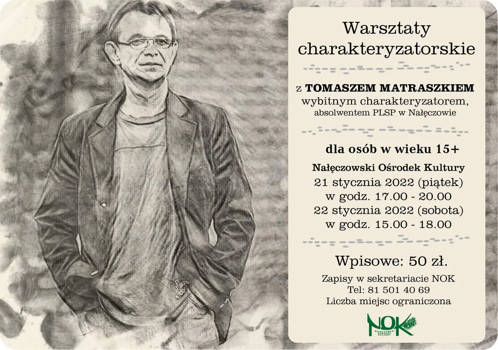 - Na warsztaty zapraszamy wszystkich zainteresowanych charakteryzacją mieszkańców gminy Nałęczów, którzy mają minimum 15 lat. Zapisywać można się do wyczerpania miejsc - powiedział Łukasz Król, dyrektor NOK.