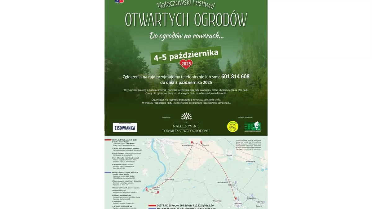 Organizatorzy – Nałęczowskie Towarzystwo Ogrodowe – zachęcają, by zabrać rodzinę, przyjaciół i dobry humor. Rajd to doskonała okazja, by spędzić czas na świeżym powietrzu, zadbać o zdrowie i kondycję, a przy okazji poznać uroki jesiennego Nałęczowa – miasta, które od lat przyciąga swoim urokiem i wyjątkową atmosferą.