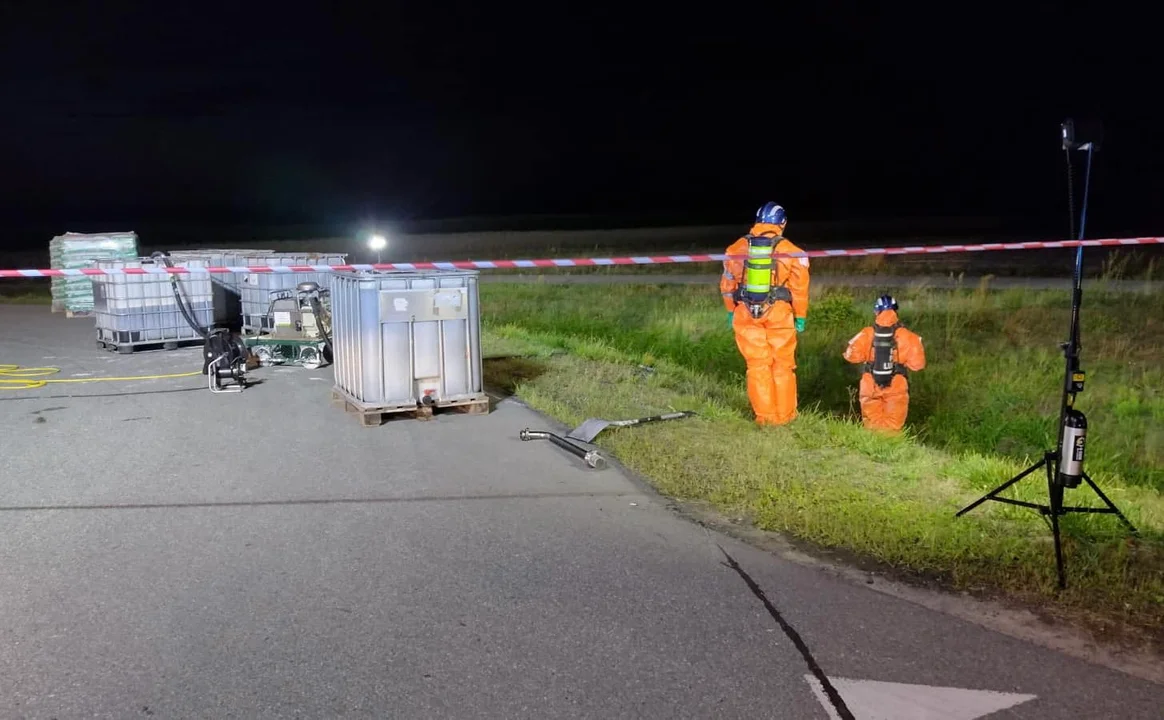 Do nietypowego zdarzenia doszło w czwartkowe popołudnie (27 lipca) na wjeździe na drogę ekspresową S 12 na węźle Sielce, na terenie gminy Końskowola. Z jadącego tamtędy ciężarowego volvo spadły pojemniki z kwasem siarkowym. Niebezpieczna substancja rozlała się na drogę i dostała się do pobliskiego rowu. Do akcji wkroczyli strażacy z Komendy Miejskiej PSP z Lublina, Komendy Powiatowej PSP w Puławach, z Zakładowej Straży Pożarnej Grupy Azoty "Zakłady Azotowe Puławy" oraz strażacy ochotnicy z okolicznych OSP. Policja zablokowała ruch i kierowała na objazdy. To, co nie wyciekło musiało zostać przeładowane do innych zbiorników.