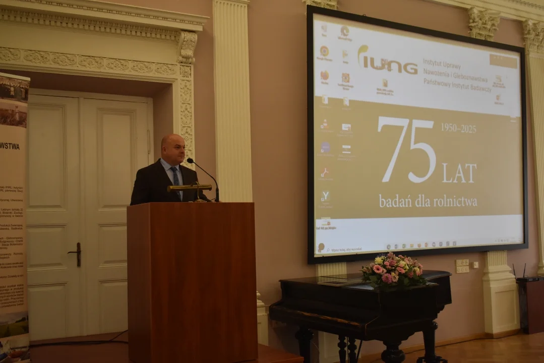 Dzisiejsze uroczystości zorganizowano w siedzibie IUNG - Pałacu Książąt Czartoryskich. Jak w swoim przemówieniu na otwarciu obchodów podkreślał dyrektor Mariusz Matyka, dużą zasługę w tym, że taka jednostka może działać w Puławach ma właśnie ród Czartoryskich, który chciał, aby jego majątek przysłużył się ogółowi społeczeństwa. I IUNG od lat realizuje tę misję, stale wspierając rolnictwo i służąc mu swoją wiedzą. Stąd na sali obecna była księżna Barbara Czartoryska, na ręce której dyrektor Matyka złożył kwiaty. 75- lecie IUNG zgromadziło w Puławach także przedstawicieli wielu innych instytytów podległych Ministerstwu Rolnictwa i innych podmiotów związanycn z tą sferą, a ściśle współpracujących z Instrtutem Uprawy Nawożenia i Gleboznawstwa. Goście kolejno zabierający głos podkreślali wiodącą rolę IUNG-u w badaniach dla rolnictwa, nie tylko w Polsce, ale i w Europie, wysoki poziom prowadzonych badań i profesjonalizm kadry. Na ręce dyrektora składali gratulacje, zwracając jednocześnie uwagę na otwartość jednostki na współpracę zarówno ze środowiskiem naukowym, komercyjnym i samorządem. Jednym z ważniejszych momentów uroczystości było wręczenie odznaczeń Za Długoletnią Służbę oraz "Zasłużony dla Rolnictwa". Aktu dekoracji dokonał Minister Czesław Siekierski w asyście dyrektora Mariusza Matyki.