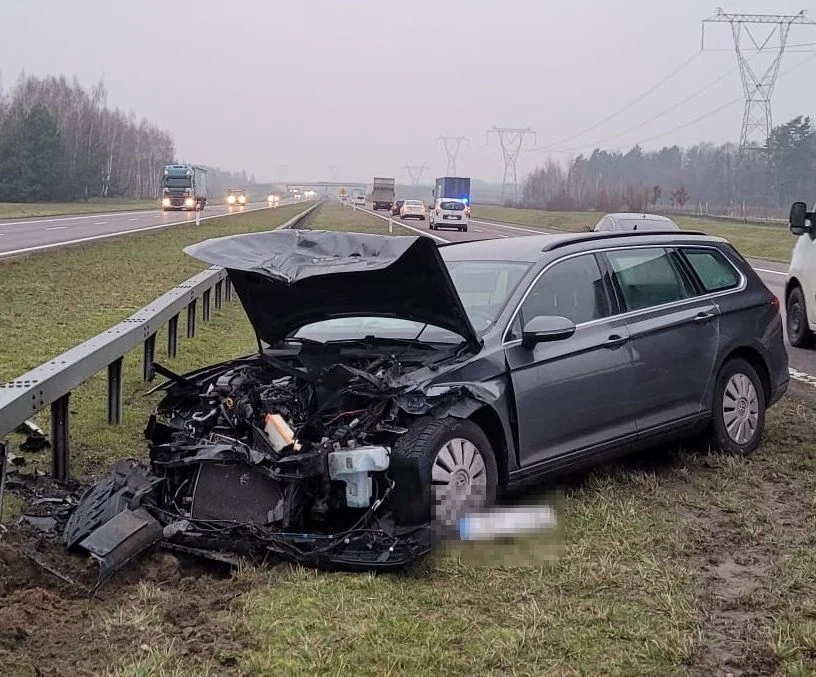 48-letni kierowca volkswagena najechał na tył naczepy jadącej przed nim ciężarówki, po czym odbił się, uderzając w barierę energochłonna. Z jego relacji wynika, że wracał zmęczony z pracy i zasnął za kierownicą. Mężczyzna może mówić o wielkim szczęściu, bo nic poważnego mu się nie stało. Ze zdarzenia wyszedł z ogólnymi potłuczeniami. Zarówno kierowca volkswagena, jak i kierowca ciężarówki byli trzeźwi.