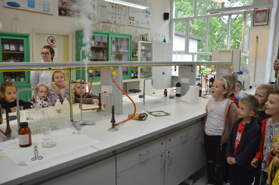 Z zaproszenia uczniów "Chemika" skorzystały dzieci z Miejskiego Przedszkola nr 18 i dwie grupy z Niepublicznego Przedszkola Kraina Wiedzy z Puław oraz Niepubliczne Przedszkole Kolorowe Kredki z Nałęczowa. W trakcie spotkania dzieci nie tylko zwiedzały szkołę, ale i również mogły wziąć udział w specjalnie dla nich zorganizowanych lekcjach. Najpierw odbyły się zajęcia z wychowania fizycznego. W hali odbywały się ćwiczenia oraz gry i zabawy. Duże zainteresowanie wzbudziły pokazy chemiczne. Uczniowie wykonywali na oczach przedszkolaków doświadczenia. Mali goście byli pod wrażeniem ich efektów. Na pokazowej lekcji informatyki do obejrzenia był krótki film przedstawiający zagrożenia w internecie oraz specjalnie przygotowana gra.