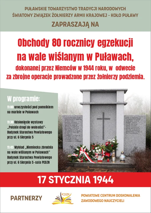 Na godz. 11:00 zaplanowano złożenie hołdu oraz kwiatów przy pomniku, który znajduje się na Marinie. Następnie w Bibliotece Powiatowej odbędzie się otwarcie wystawy pt. "Polskie Drogi do Niepodległości". Z kolei o 12:00 w sali wykładowej Powiatowego Centrum Doskonalenia Nauczycieli przy ul. 6 Sierpnia 5, historyk oraz dyrektor ZS nr 1 Robert Och wygłosi wykład "Hitlerowska Zbrodnia na Wale Wiślanym". Organizatorami wydarzenia są Puławskie Towarzystwo Tradycji Narodowych oraz Światowy Związek Żołnierzy AK Koło Puławy.