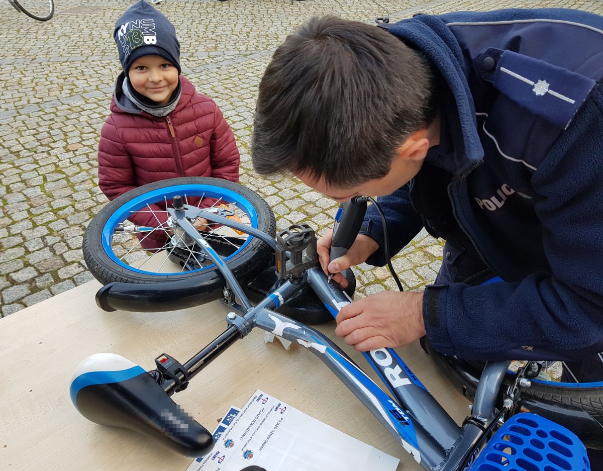 Podczas festynu na skwerze, policjanci dbali o bezpieczeństwo uczestników oraz znakowali rowery.
