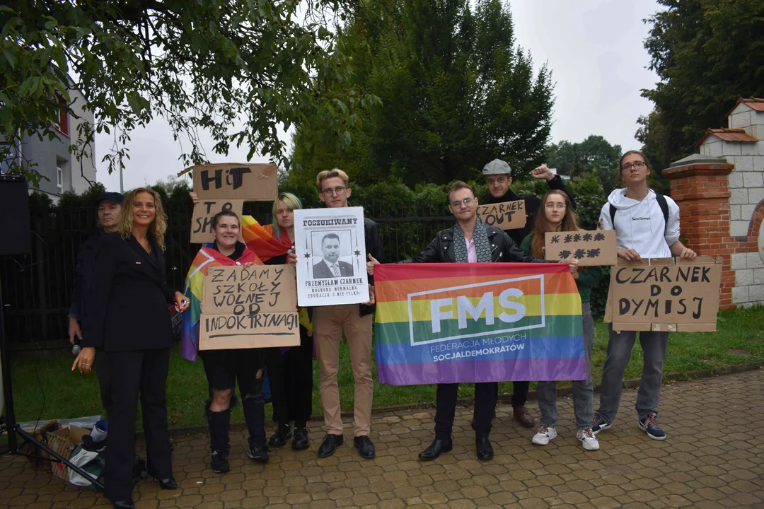 Jeszcze przed rozpoczęciem się uroczystości przed budynkiem szkoły ustawili się przedstawiciele Federacji Młodych Socjaldemokratów z Puław i z Lublina. Przynieśli ze sobą transparenty, m.in. z wizerunkiem ministra Czarnka, a z głośników puszczali muzykę. W ten sposób chcieli zwrócić uwagę na ich zdaniem złe posunięcia resortu edukacji. Chodzi przede wszystkim o wprowadzony od tego roku szkolnego nowy przedmiot, którego uczą się uczniowie szkół średnich - historia i teraźniejszość.