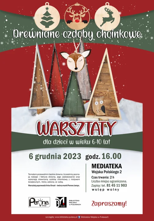 Biblioteka Miejska w Puławach zaprasza dzieci w wieku od 6 do 10 lat na warsztaty rękodzielnicze, podczas których najmłodsi będą mieli możliwość poznać rodzaje, fakturę i niecodzienne zastosowanie drewna oraz samodzielnie stworzyć oryginalne i ekologiczne drewniane ozdoby choinkowe.