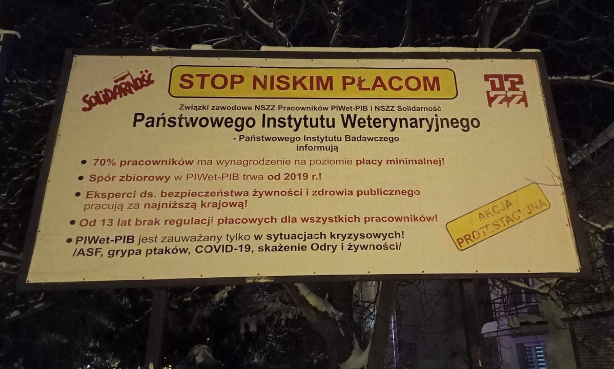 W Państwowym Instytucie Weterynarii-Państwowym Instytucie Badawczym nastroje nie do pozazdroszczenia. Mieszkańcy Puław mogą się o tym dowiedzieć z jednego z... bilbordów w mieście, który stanął przy ul. Lubelskiej. "STOP NISKIM PŁACOM" oraz "AKCJA PROTESTACYJNA" - głoszą jego główne hasła.