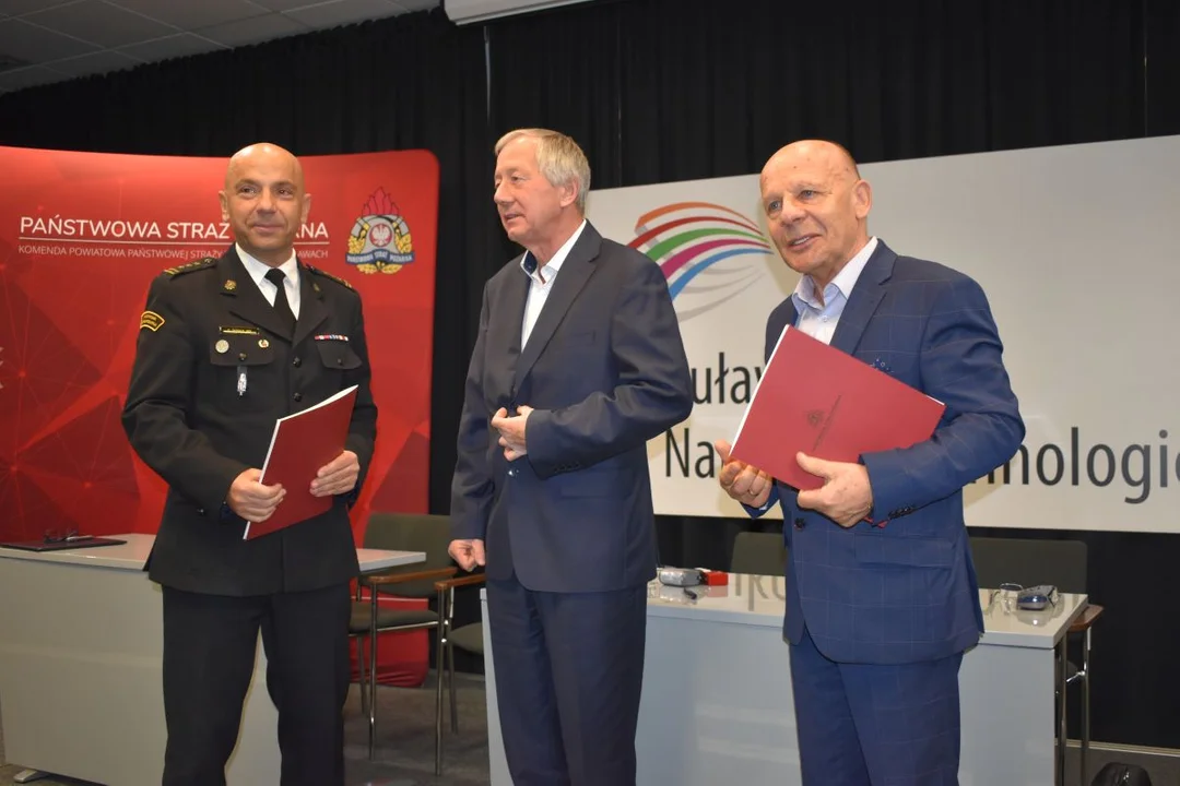 Przetarg na budowę nowej komendy straży pożarnej w Puławach rozstrzygnięto w połowie października. Strażacy już przeprowadzili się do tymczasowej siedziby na terenie Puławskiego Parku Naukowo - Technologicznego. Tam też dzisiaj (piątek, 28 października) zorganizowano oficjalne podpisanie umowy między inwestorem a wykonawcą, reprezentowanym przez Aleksandra Nowaka i Edward Brackiego, współwłaścicieli "NOWBUD-u".