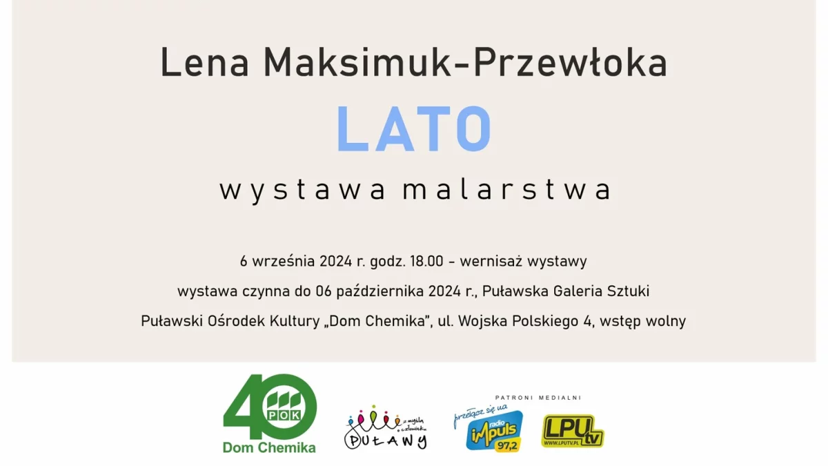 Wernisaż został zaplanowany na 6 września o godz. 18:00 w Puławskiej Galerii Sztuki w POK "Dom Chemika". Wystawę będzie można podziwiać do 6 października. Wstęp wolny.