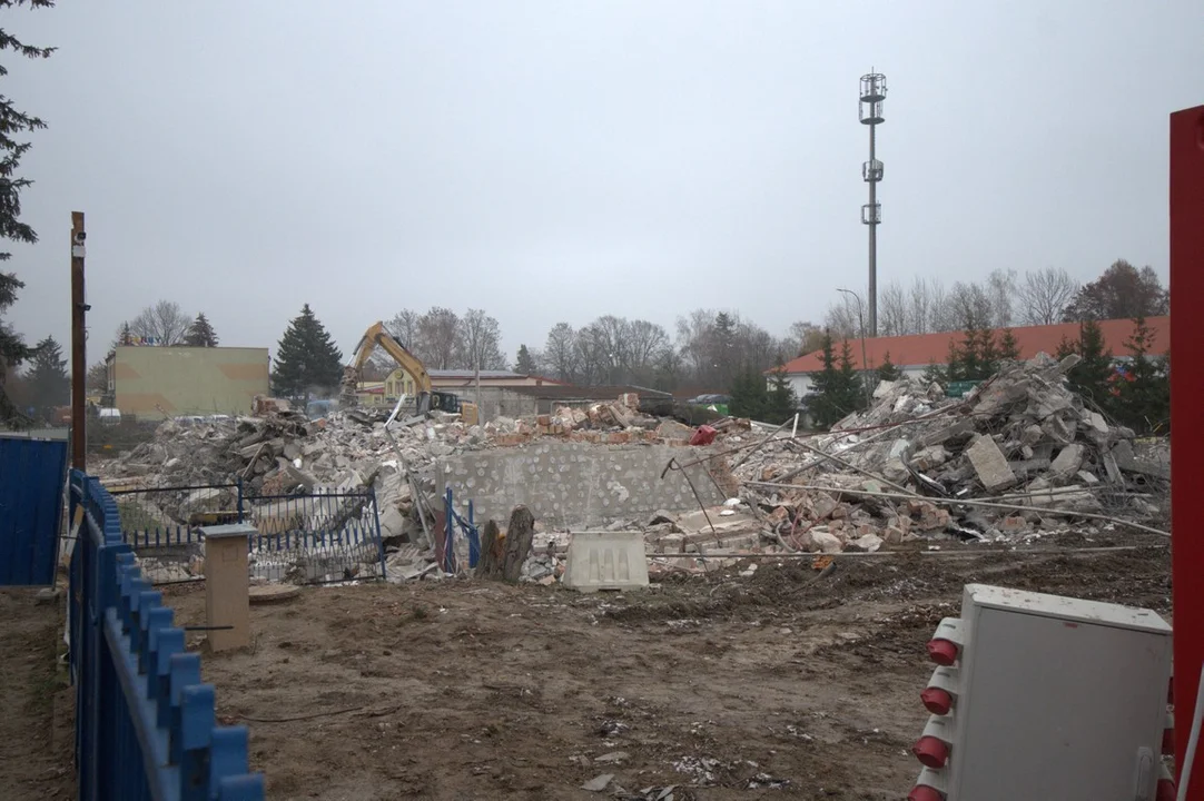 Jeszcze przed weekendem budynek stał. W poniedziałek rozpoczęło się ostateczne wyburzanie, wkroczył ciężki sprzęt, który ściana po ścianie demolował obiekt.