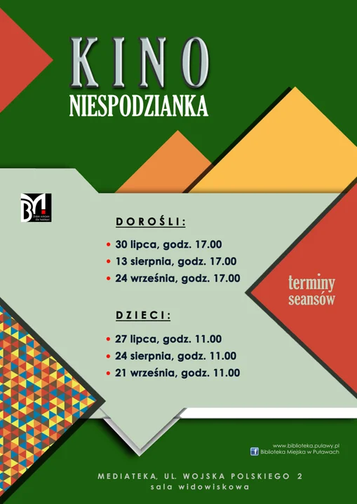 "Kino Niespodzianka" to cykl zainicjowany przez Miejską Bibliotekę w Puławach. W jego ramach, w każdym miesiącu ma miejsce bezpłatny (wystarczy karta biblioteczna) pokaz wybranego filmu – często na podstawie książki. W najbliższych miesiącach biblioteka przygotowała pokazy nie tylko dla najmłodszych czytelników, ale także tych dorosłych.