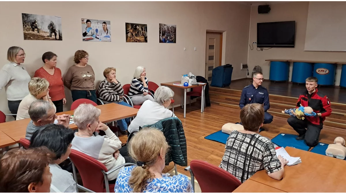 Podczas warsztaów seniorzy poznawali podstawowe zasady udzielania pierwszej pomocy, uczyli się, jak rozpoznawać stany zagrożenia życia oraz prawidłowo wzywać pomoc. Ważnym elementem spotkania była część praktyczna – każdy uczestnik mógł zadawać pytania, korzystać ze specjalistycznego sprzętu oraz ćwiczyć niezbędne umiejętności pod okiem doświadczonych instruktorów.