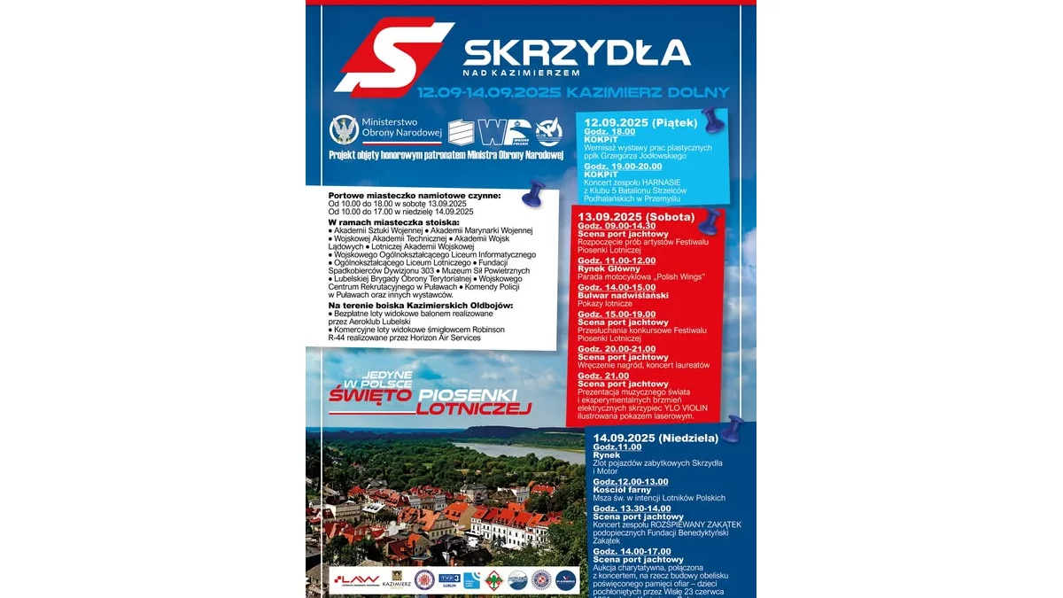 To jedyny w Polsce festiwal piosenki lotniczej, który po raz kolejny połączy muzykę, historię, technologię i pasję do lotnictwa. W programie przewidziano koncerty, pokazy sprzętu wojskowego i lotniczego, spotkania z żołnierzami, rekonstruktorami, a także prezentacje nowoczesnych technologii obronnych.