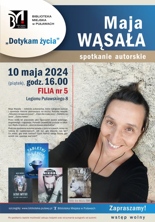 Informacje puławskie Biblioteka Miejska w Puławach zaprasza 10 maja o godzinie 16.00 do Filii nr 5 (ul. Legionu Puławskiego 8) na spotkanie z Mają Wąsałą. Autorka książek “Nikodem terapeuta duszy”, “Fotel dla mojej żony”, “Tabletki na życie” i “Dzika matka” opowie o swojej drodze pisarskiej oraz podzieli się z uczestnikami spotkania swoim sposobem na dobre życie i przezwyciężanie codziennych trudności.