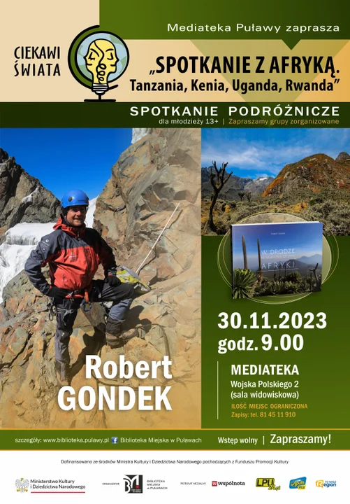 Robert Gondek to fotograf przyrody, podróżnik i miłośnik Afryki. Gościem Biblioteki Miejskiej w Puławach będzie w ramach projektu podróżniczego „Ciekawi świata” dofinansowanego ze środków MKiDN. Podczas potkania adresowanego do młodzież 13+ Robert Gondek najwyższych afrykańskich górach: pokrytym lodowcami Kilimandżaro i kolorowych Górach Księżycowych w Ugandzie, ale także tętniących życiem afrykańskich parkach narodowych czy masajskich wioskach w Tanzanii. Opowieść uzupełni prezentacja zdjęć.