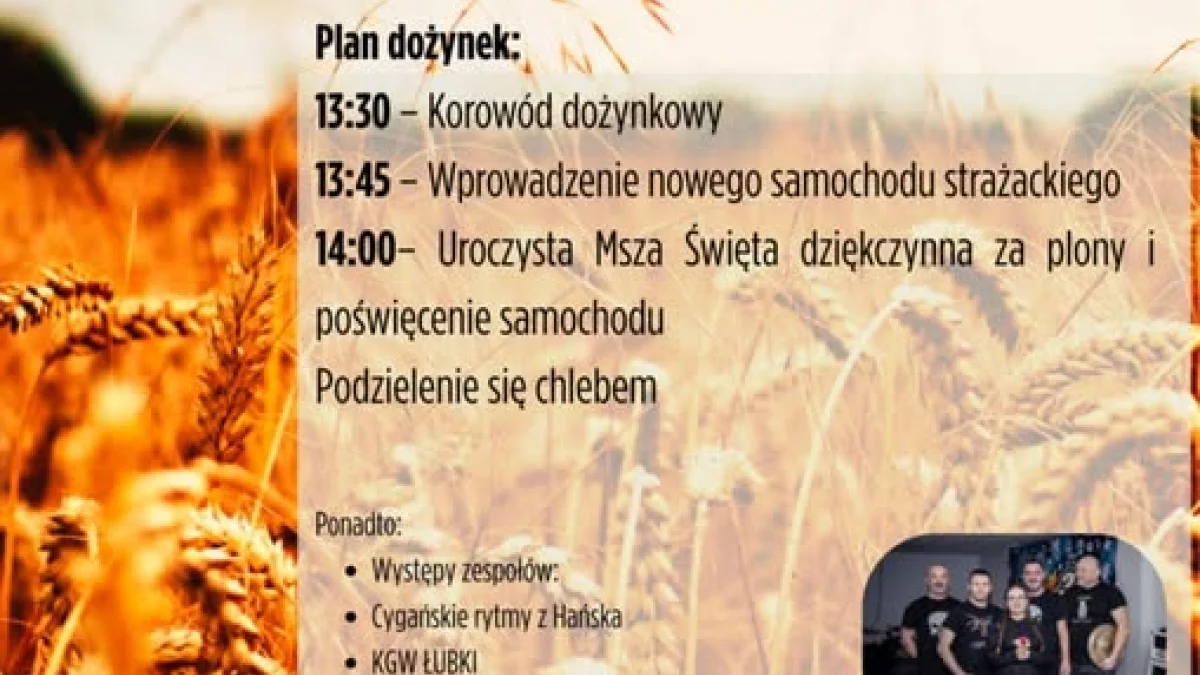 Centralnym punktem wydarzenia będzie uroczysta Msza święta dziękczynna za plony, która rozpocznie się o godz. 14:00. Liturgii towarzyszyć będzie poświęcenie nowego samochodu strażackiego, a następnie tradycyjne dzielenie się chlebem.