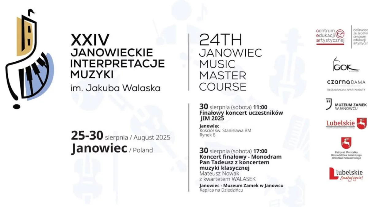 To prawdziwa uczta artystyczna – od koncertów kameralnych, przez występy uczestników warsztatów, aż po uroczysty koncert galowy oraz niepowtarzalny monodram Pan Tadeusz w połączeniu z muzyką klasyczną.