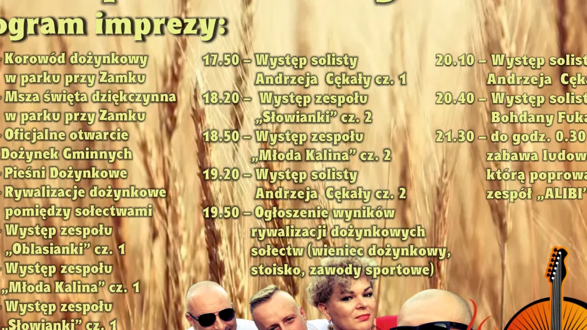 Na uczestników wydarzenia czeka bogaty program artystyczny: występy zespołów folklorystycznych, koncerty, konkursy i prezentacje sołectw. Nie zabraknie również tradycyjnych pieśni dożynkowych oraz rywalizacji o najpiękniejszy wieniec i najciekawsze stoisko. Gwiazdą wieczoru będzie zespół "Alibi", który poprowadzi zabawę ludową do późnych godzin nocnych.