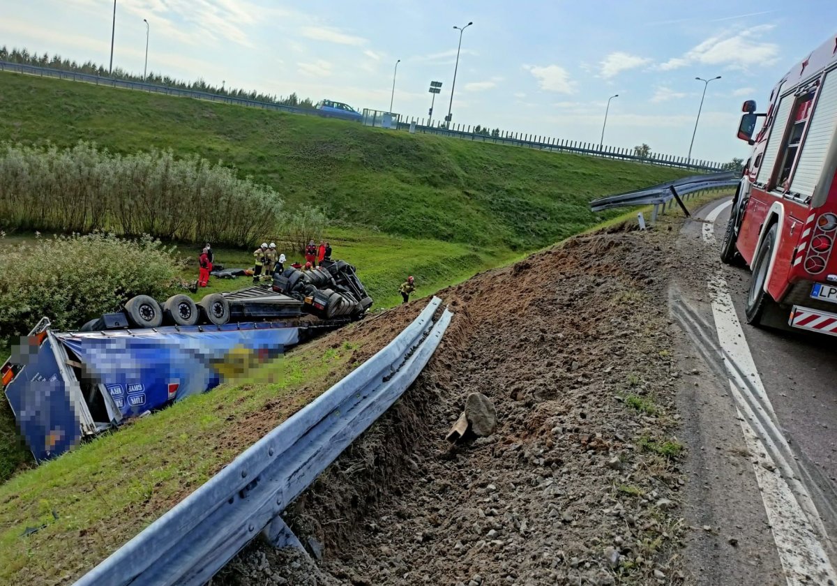 Jak informuje puławska policja do zdarzenia doszło tuż przed godz. 11.00. Kierujący samochodem ciężarowym marki Scania na łączniku drogi eskpresowej S17 z drogą S12 w kierunku Radomia uderzył w bariery energochłonne i zjechał z nasypu. Pojazd przewrócił się na dach. Kierowca został zakleszczony w kabinie. Aktualnie trwa akcja ratunkowa. Dlatego policja kieruje na objazd.