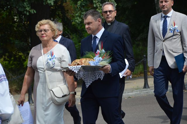 Uroczystości dożynkowe rozpoczęły się tradycyjnie od mszy św., podczas której poświęcono przygotowane wieńce, po czym kolorowy korowód przemaszerował na plac przed urzędem miasta.