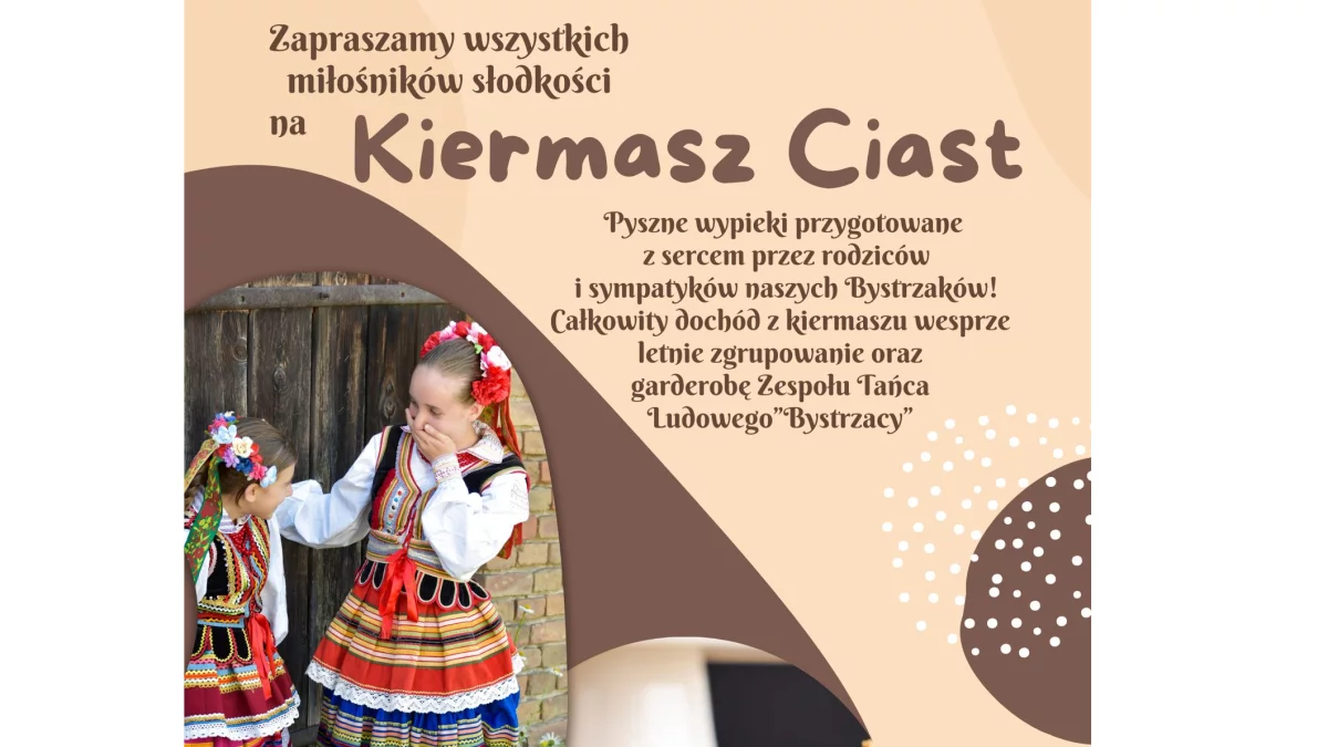 Kiermasz ma jednak nie tylko słodki, ale i bardzo konkretny cel. Dochód ze sprzedaży zostanie przeznaczony na wsparcie wakacyjnego zgrupowania zespołu w Okunince. Dodatkowo zebrane środki pomogą uzupełnić brakujące elementy strojów, które są nieodłączną częścią działalności zespołu ludowego.
