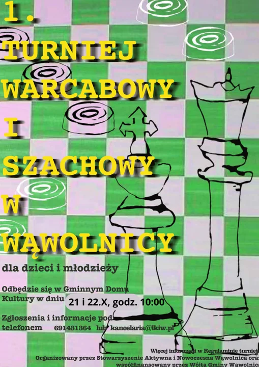 691 431 364 lub drogą mailową na adres wawolnica.gdk@gmail.com albo kancelaria@lkiw.p. W zgłoszeniu należy podać imię i nazwisko uczestnika, rok urodzenia, miejscowość, szkołę, klasę oraz rodzaj turnieju (warcaby lub szachy).